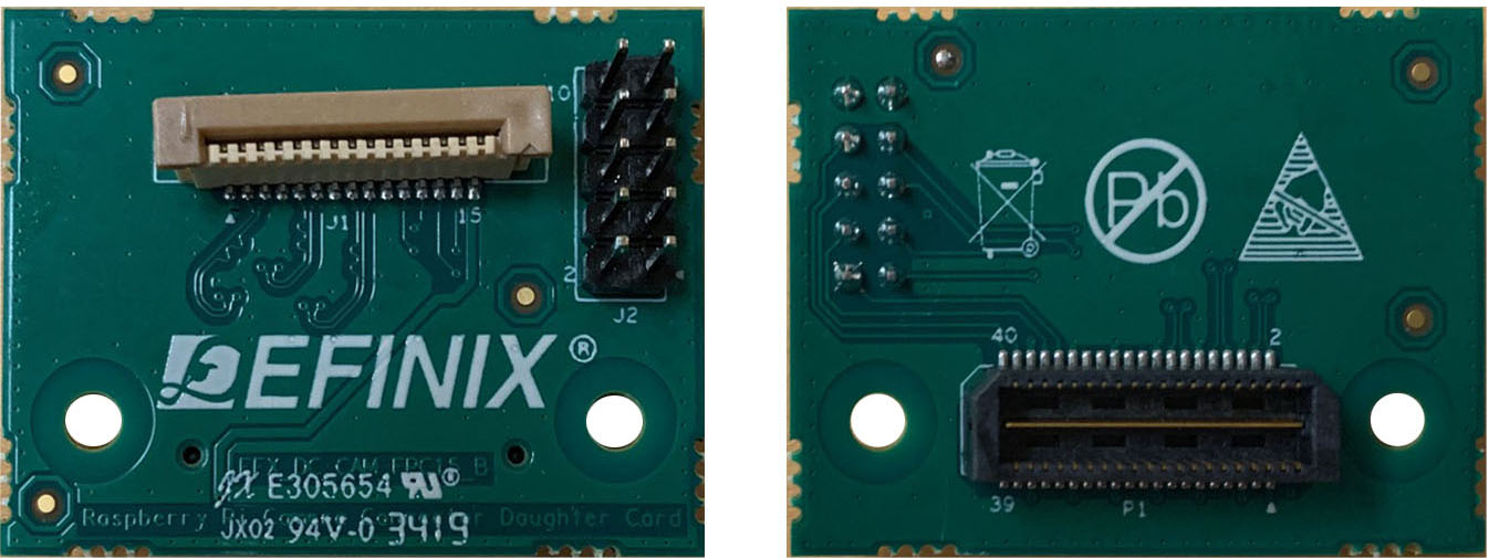 The Coral Camera Connector Daughter Card bridges between Efinix development board and a Coral camera module. The daughter card connects to the camera using a 24-pin flat cable.